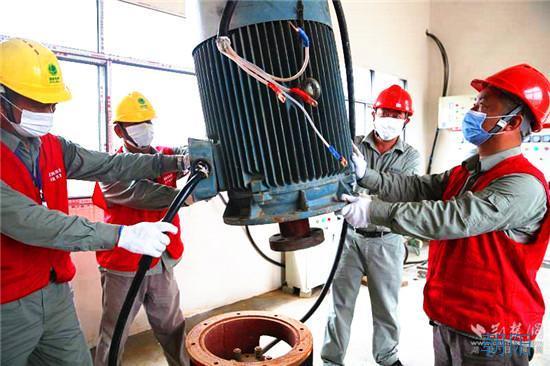 原200千伏安的變壓器被吊下配變臺(tái)架,新調(diào)來的315千伏安的變壓器平穩(wěn)地落座在配變臺(tái)架上……通過近4個(gè)小時(shí)的安裝、調(diào)試,接通10千伏千畝湖支線等一系列的緊張作業(yè)。19時(shí)02分,2臺(tái)先期安裝好的55千瓦的水泵成功發(fā)起,兩股水流沖出千畝湖,流向遠(yuǎn)方。